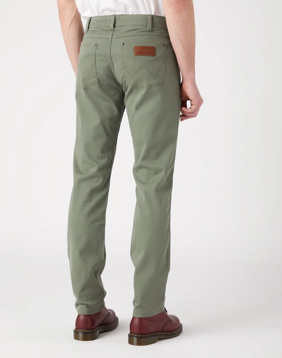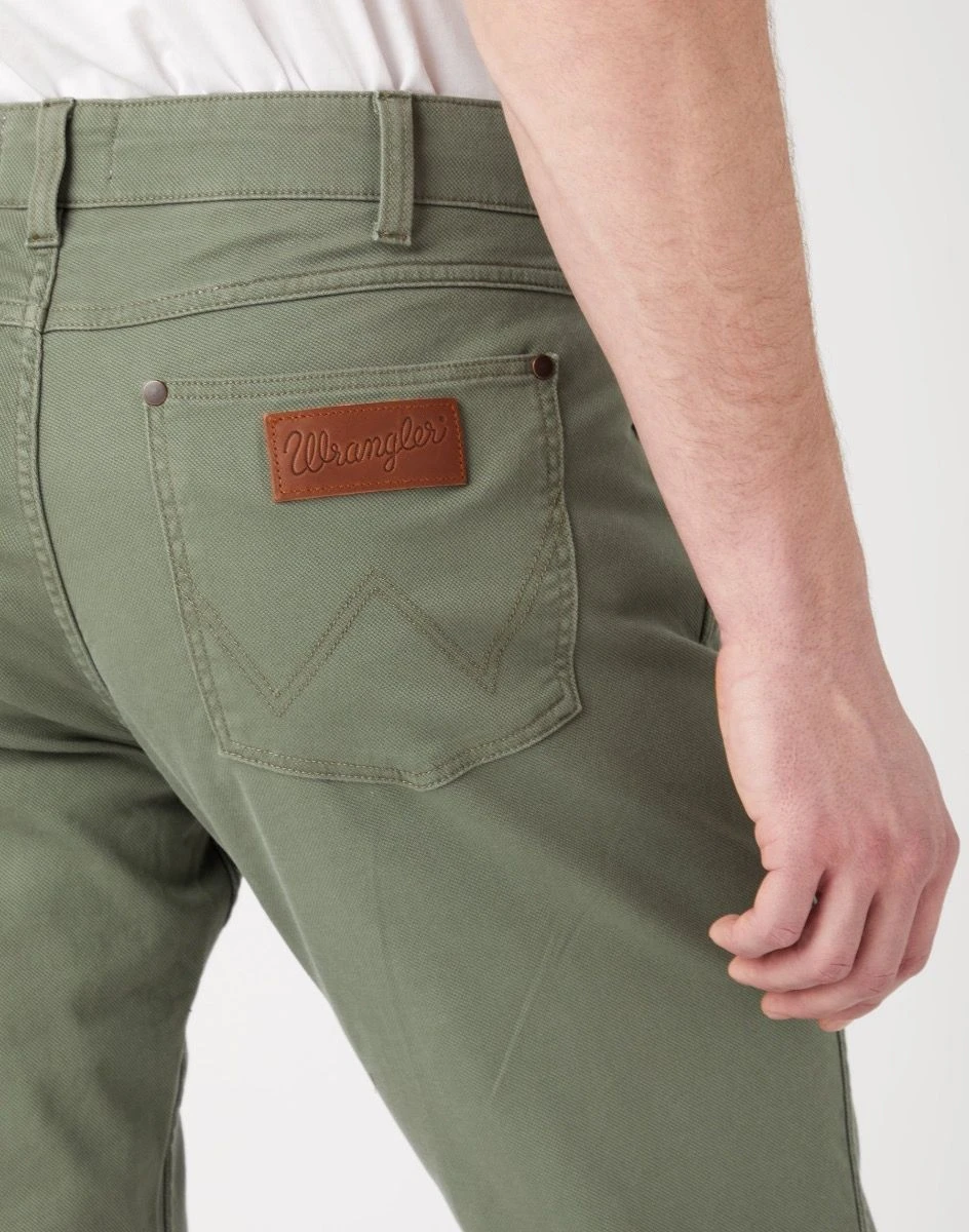 Wrangler Greensboro chino jeans in colour dusty olive feature a low rise waist, zip fly, regular fit through the thigh and a straight leg. A well-loved classic for a reason. The ideal smart-casual style for work and play. Low-stretch material for just the right amount of freedom of movement. Authentic Wrangler stitching and logo patch.
